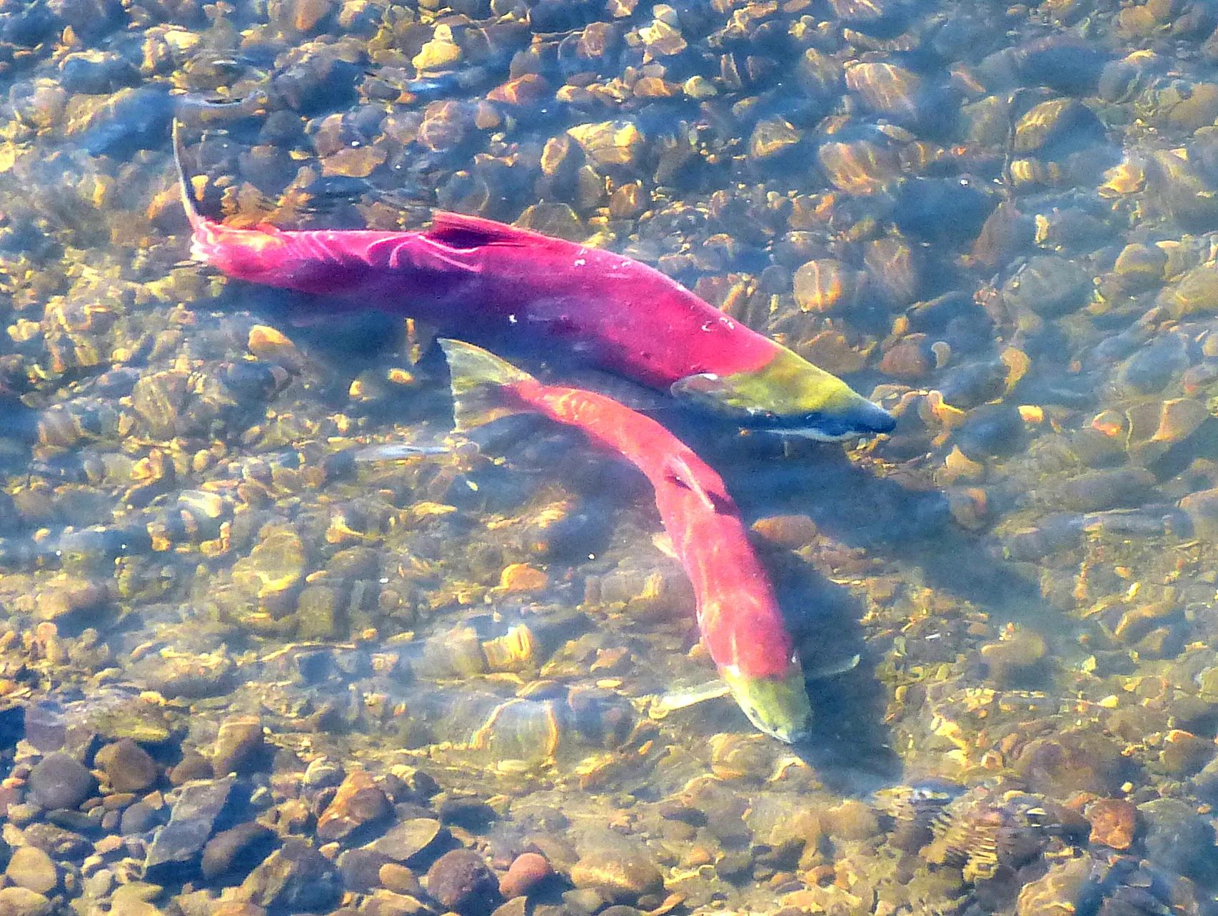 As they approach spawning, it’s as if the fiery color inside smolders out into the light. At the peak of breeding, sockeyes embody everything that’s spectacular about salmon. Arrayed across their spawning beds, they look like hundreds of scarlet ribbons weaving through the clear, cold water, suspended above the mosaic of multicolored pebbles.