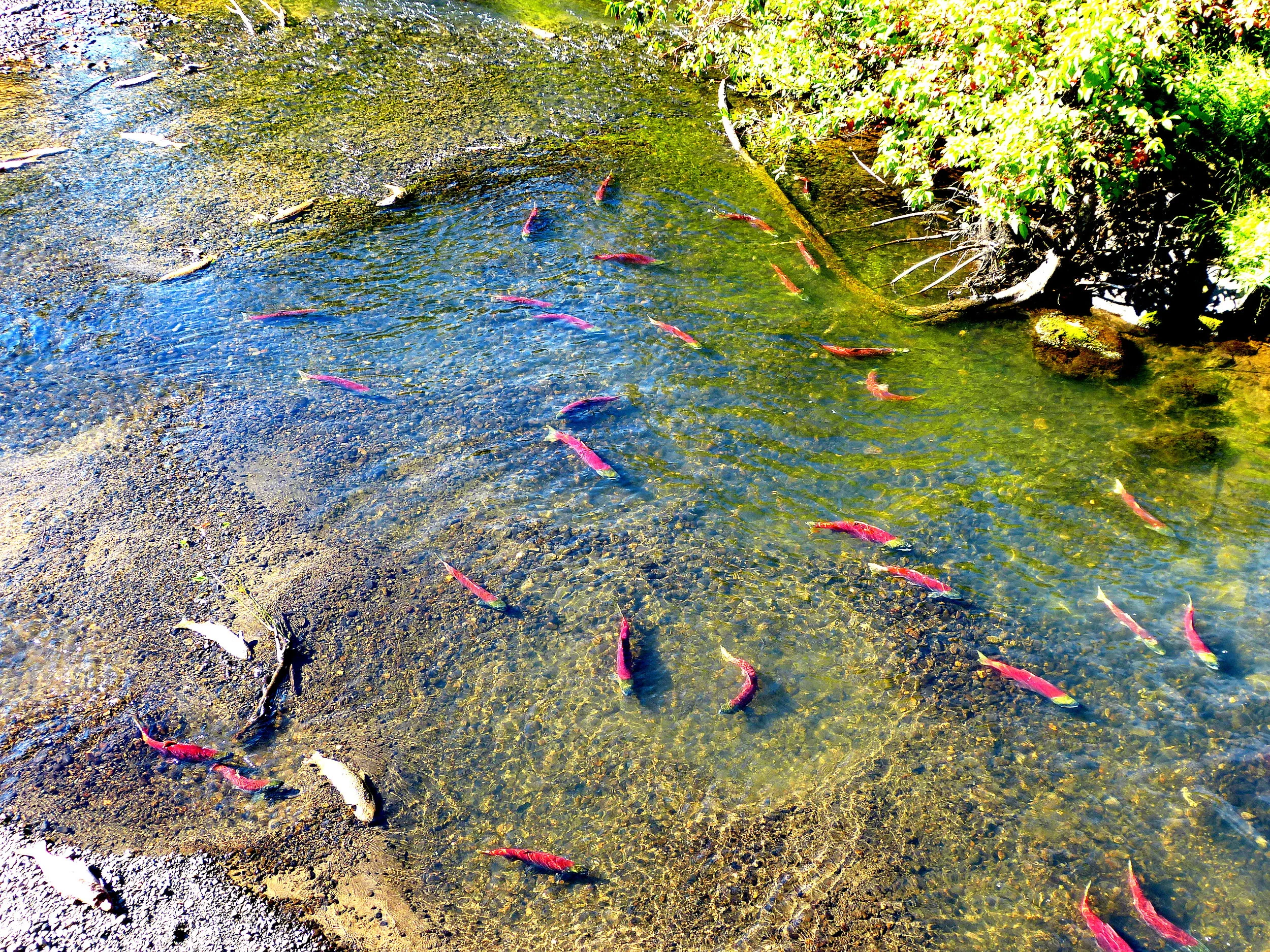 In any case, like other salmon, a female sockeye uses her tail to excavate a shallow depression where an accompanying male fertilizes her emerging eggs. She does this in several nests…and within a few weeks, she and her male consorts will die, leaving a legacy of nutrients to fertilize the waters where their young will grow. And eventually, these offspring will head out to sea — shimmering silver jewels destined to become one of earth’s great living treasures.