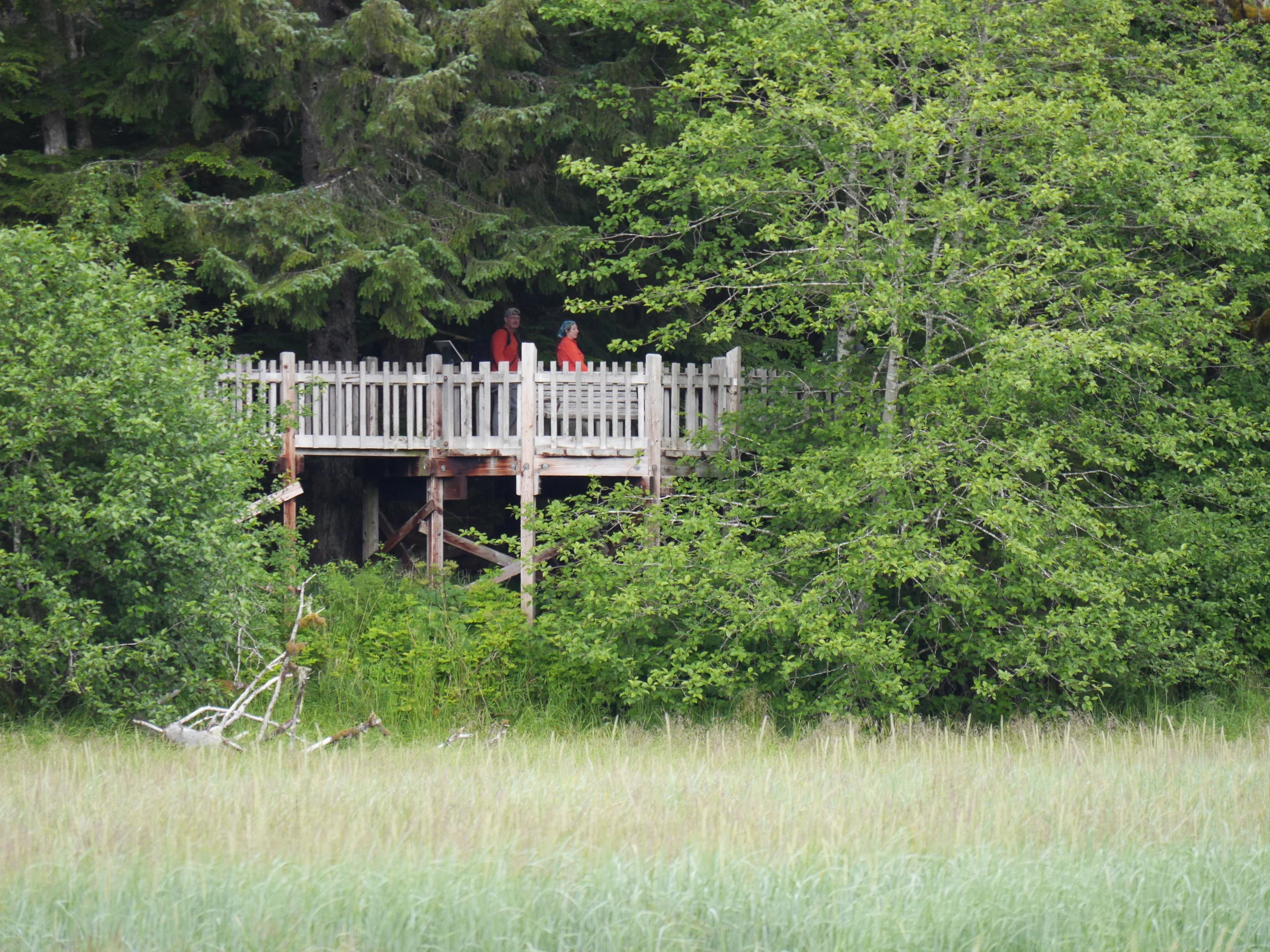 For townies and tourists alike, the Starrigavan Creek estuary is a favorite place for a stroll on the rough-cut boardwalk to watch an elegant great blue heron standing perfectly still, as if lost in a dream, intent on spotting her next meal of small fish; to hear the abundant songbirds trill their morning declarations of territory and joy (click to hear “Starrigavan Estuary Songbirds audio by Richard Nelson); to see a brown bear and her cubs grazing lush spring grasses — and later in the summer — catching salmon.
